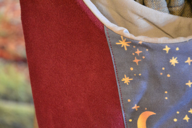 Couleurs: extérieur rouge bordeaux avec un appliqué à thème, intérieur gris clair