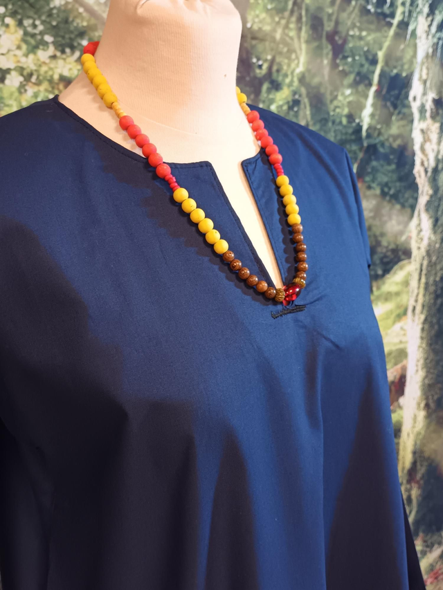 Ample et confortable. Peut se porter avec une ceinture pour affiner et cintrer au niveau de la taille.